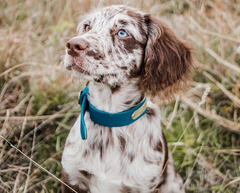 They’re usually white, black, silver, gray, or blue with a combination of patterns, including spotted, tricolor, and merle.